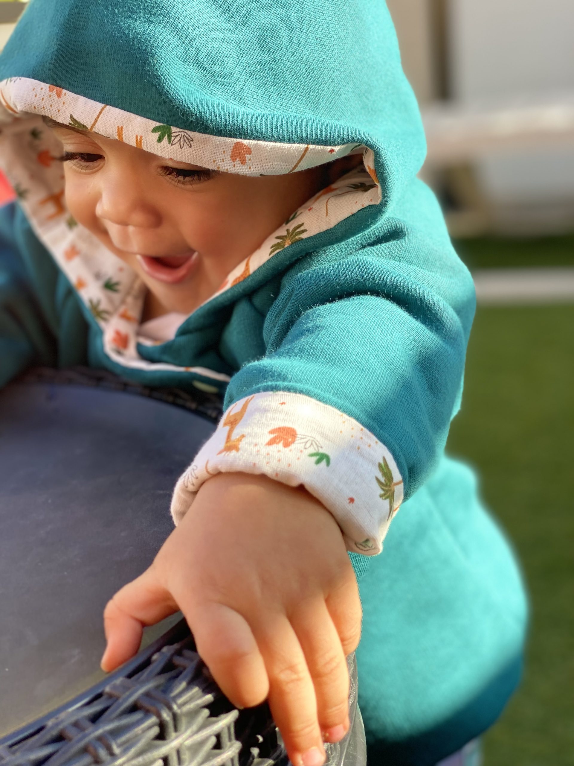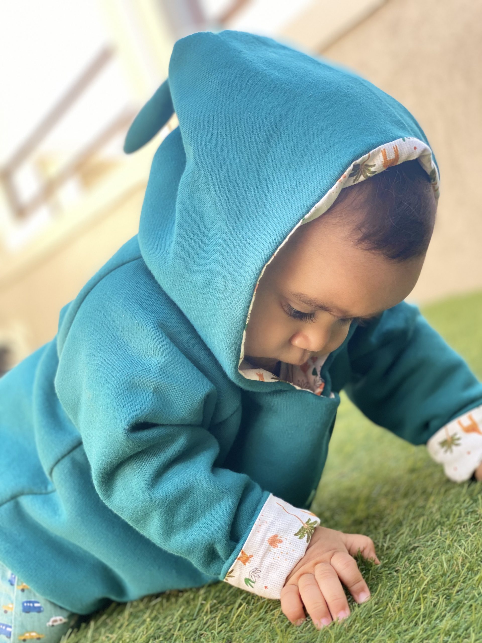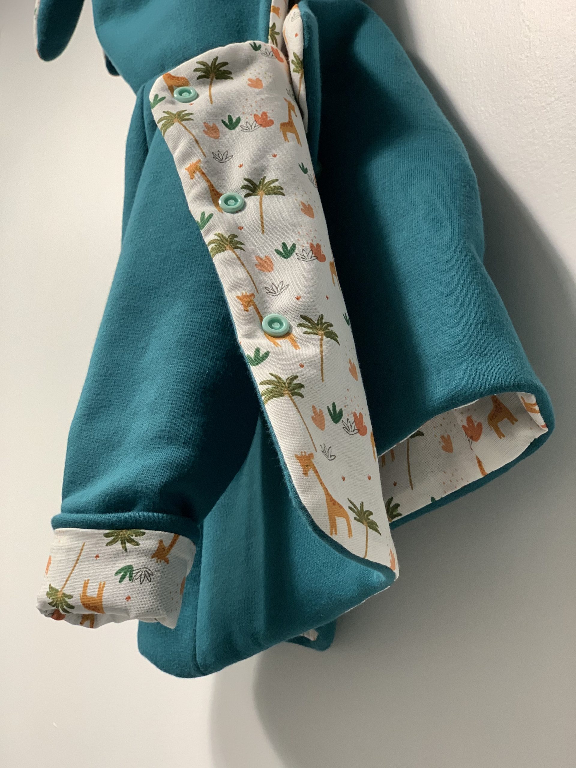 Détails : les oreilles de lapin sur la capuche et fermeture par des pressions KAM Oekotex