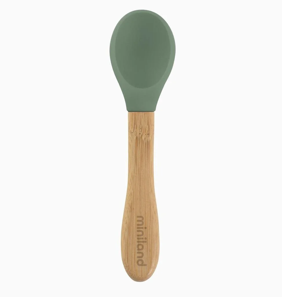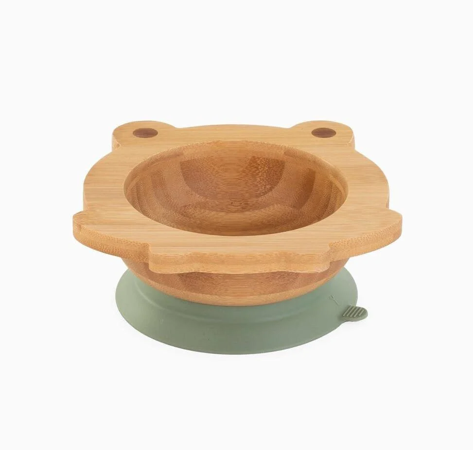 Wooden bowl Frog Grenouille – Miniland composé d’un bol en bois de bambou certifié FSC (Forest Stewardship Council avec ventouse sur sa partie inférieure et d’une cuillère avec tête en silicone.