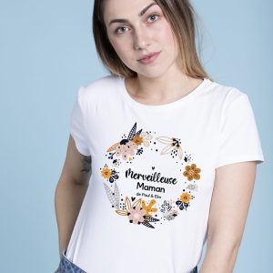 T-shirt Personnalisé « Merveilleuse Maman de [prénom] » avec Couronne de Fleurs – Cadeau Unique pour Maman – Disponible en S, M, L, XL, XXL – T-shirt Confortable Personnalisé